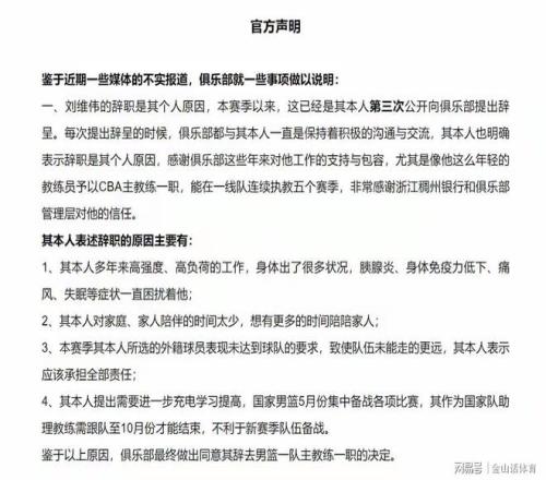 三天后,浙江稠州职业篮球俱乐部官方宣布,经俱乐部慎重研究并报董事会批准,同意刘维伟辞去俱乐部男篮一队主教练一职。值得一提的是,这份公告洋洋洒洒近千字,重点意思为,刘维伟辞职是其个人原因,俱乐部对他工作很支持和包容;本赛季选的外籍不好,他本人表示应该承担全部责任;当年俱乐部不同意放威姆斯,是教练组选择了放弃……