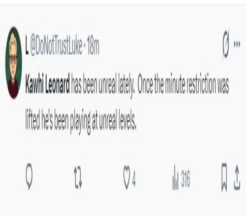 美球迷:自从莱昂纳德解除了登场时间限制后,他的表现就超乎寻常了。