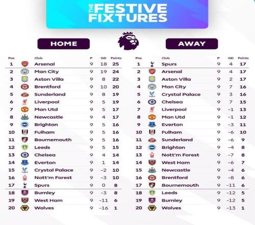 据数据显示,在英超联赛已进行的9个主客场比赛中,各队表现呈现巨大差异。阿森纳凭借主场25分的强势表现领跑主场积分榜,而托特纳姆热刺则上演主场低迷、客场强势的逆袭,成为客场积分榜头名。