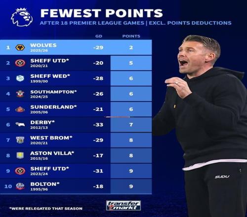 根据德转的估算,他们认为狼队本赛季最终赛季末得分仅有4分。而英超历史上单赛季最低分得主为德比郡在2007-08赛季创下的11分。