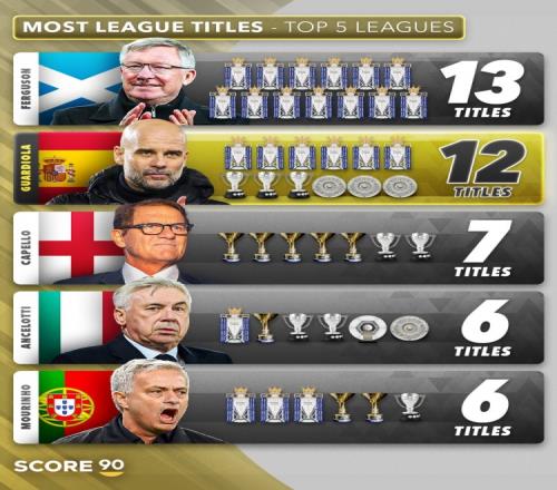 五大联赛冠军教头排行:弗格森独领风骚十三冠,瓜帅紧随其后十二冠,穆帅荣登第四六冠_英超直播